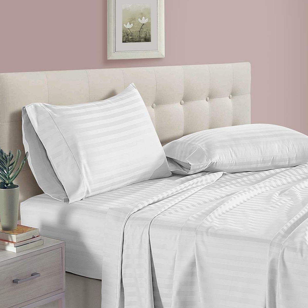 What sets Night Gold bedsheets apart? 210-400TC satin stripe or percale holds crispness through 100+ industrial washes, resists yellowing, and softens over time—flat or fitted options in single to king sizes ensure perfect fit for any hotel bed, boosting guest satisfaction and housekeeping efficiency.